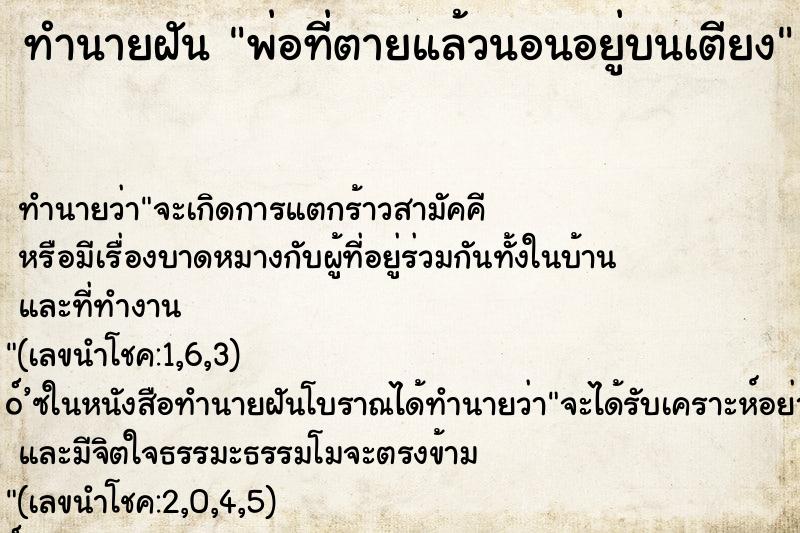 🔸ฝันเห็นวัดเก่าพระพุทธรูป 🔸ฝันว่าแพ็คกระเป๋าเดินทาง 🔸ฝันเห็นมีดตีเลข 🔸ฝันเห็นชายหญิงมีเพศสัมพันธ์เลข 🔸ฝันเห็นฮิปโป 🔸ฝันว่าพ่อเสียชีวิต
