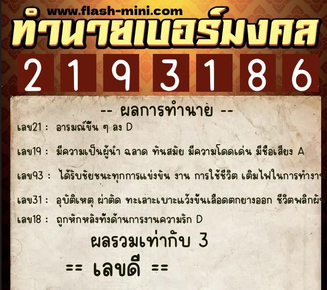 วิเคราะห์เบอร์มงคล หมายเลข 0XX-2193186 เบอร์นี้คือ เลขดี