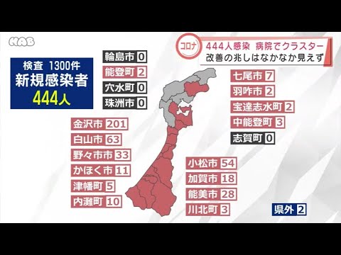 ( 28001 viewed : 19 like : 14 comments ) 感染状況が改善する兆しはなかなか見えてきません。石川県内では新型コロナウイルスの感染者が新たに444人確認されました。 県は11日午前10時までに新型コロナの検査を1300件行い、新たに444人の感染が判明しました。 自治体別では、金沢市が201人と最も多く、白山市が63人小松市が54人、野々市市が33人となっています。 今のところ感染経路が分からない人が256人と全体の6割近くを占めています。 また、金沢市にある金沢医療センターで11日までに医療従事者や患者など合わせて23人の感染が判明し、新たなクラスターに認定されました。 感染の状況を示すモニタリング指標では、病床の使用率がきのうおよそ1カ月半ぶりに30%を下回りましたが11日も26.3%と改善しています。 また、重症病床の使用率も、9.8%から、2.4%に下がっています。 [ 2022-03-11T11:37:26Z ] :flashminiupdate:2025-11-23 :::: 私のYouTubeチャンネルにアクセス @ Original Cr. ( [ 🔗 クリック‼️ ] )